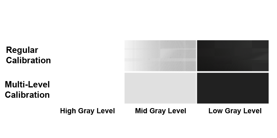 多級(jí)校正技術(shù)可消除不同灰度下的斑點(diǎn)和色塊問題,確保所有灰度級(jí)的顯示均勻一致