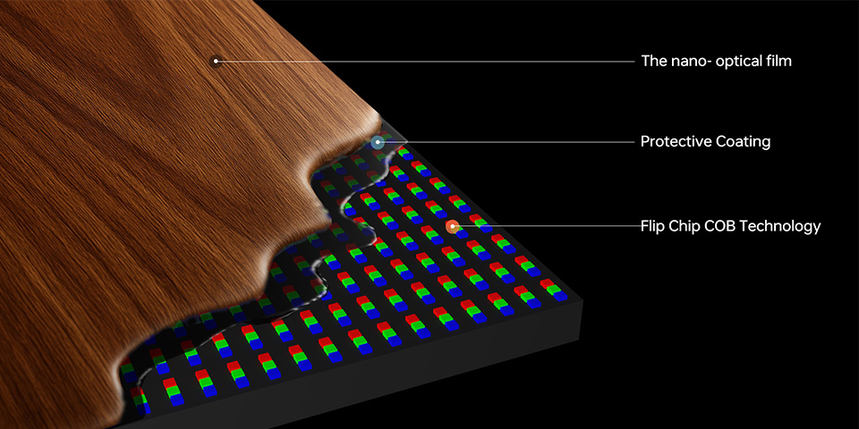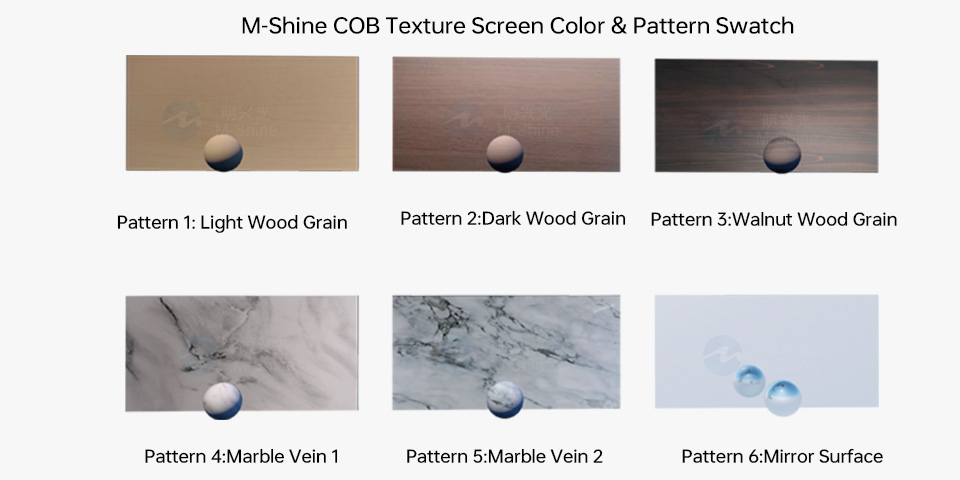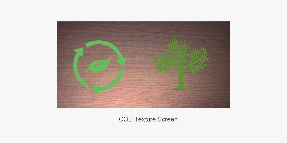 COB紋理屏的LED完全隱形,COB紋理屏的顯示質(zhì)量更佳,無顆粒感,關(guān)機(jī)狀態(tài)下的裝飾效果更逼真,使用壽命也比GOB屏更長
