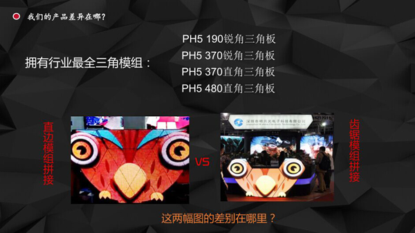 采用常規(guī)齊邊LED三角模組,拼接效果差,縫隙偏大,模塊化顯示嚴(yán)重。