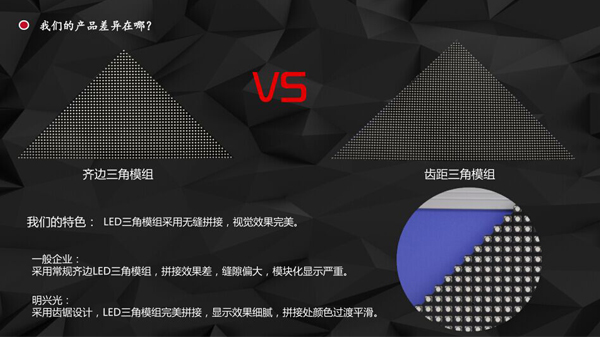 采用齒鋸設(shè)計,LED三角模組完美拼接,顯示效果細(xì)膩,拼接處顏色過渡平滑。